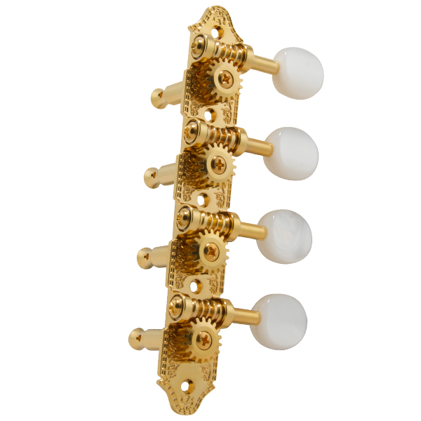 These new, professional model mandolin machine heads are the latest in technology. A specially designed, adjustable worm gear along with the die cast base maintains the center lines of the gear and worm to insure correct alignment for the finest tuning possible. The worm to gear ratio is 18:1.