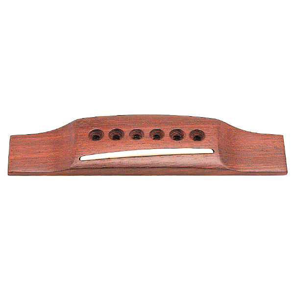 Rosewood glue-on or screw-on style guitar bridge. Holes for bridge pins. With white plastic saddle or fret.