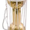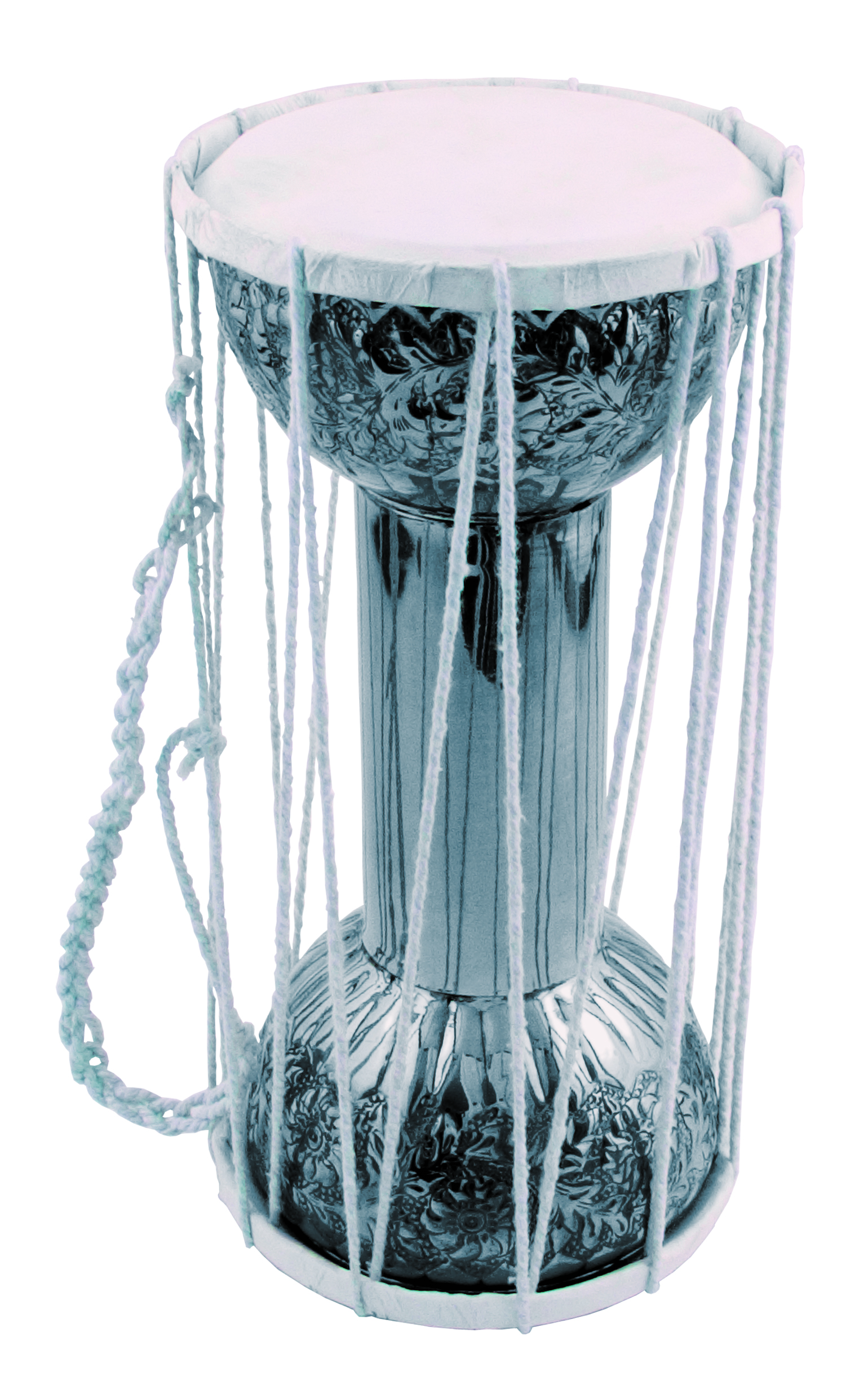 This beautiful talking drum is made of brightly plated steel with beautiful engravings. Played by holding under your armpit. Squeezing the cords alters the pitch.